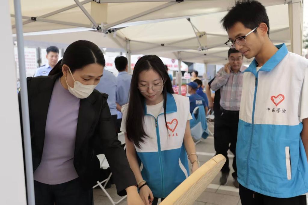 志愿者分工协作,通过中医问诊、养生功法教学、中医药科普等服务模块,将专业医疗知识与传统文化体验融入社区生活,为百余位居民提供“零距离”健康服务,助力文明市集提质增效。