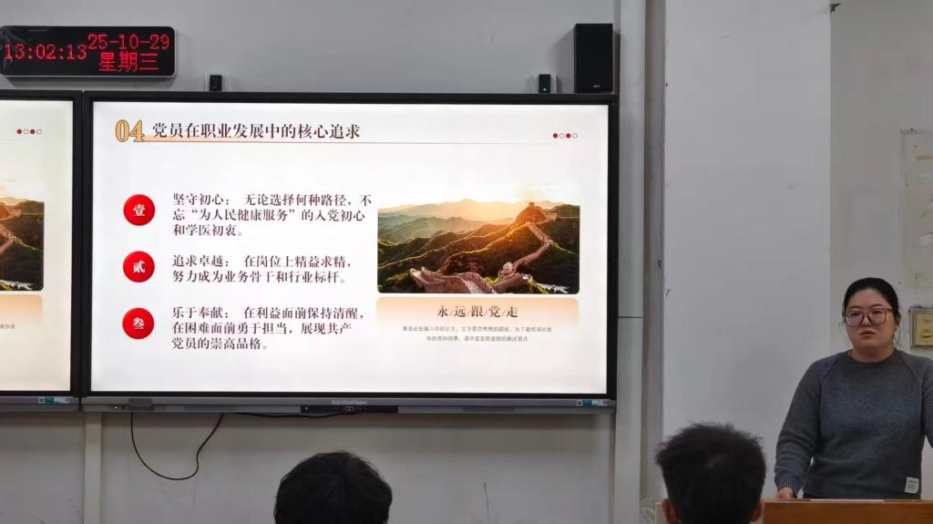 本次课程紧扣“锤炼党性、钻研医术、规划未来”的号召。先明确新时代中医药学生党员的先进性、示范性要求;再阐释“求真务实、勤奋刻苦、诚实守信”的学风内涵;接着强调党员需带头学习、守纪互助,抵制不良风气;随后分享串联式知识整合、艾宾浩斯记忆法等学业规划方法,结合专业建议临床实践与科研训练;最后结合战疫担当与行业前景,引导党员践行“大医精诚”,将个人理想融入国家需求。